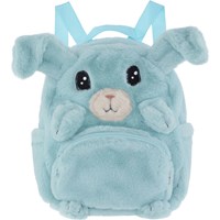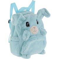 Ljusblå fuskpäls ryggsäck med en söt kaninmotiv på framsidan. Ryggsäcken har påsydda öron och tassar, en utvändig framficka med dragkedja, fickor på båda sidor, en hängslinga och justerbara axelband. Ryggsäcken mäter 24 cm i bredd och 29 cm i höjd och är speciellt idealisk för mindre barn.