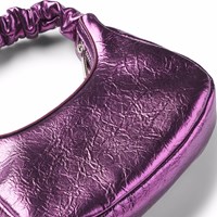 Metallisk lila handväska med dragkedjestängning. Väskan mäter 25 cm i bredd och 13,5 cm i höjd.