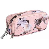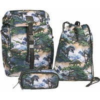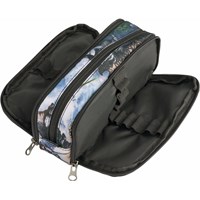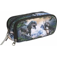 Praktiskt pennfodral med ett tryck av ett dinosaurielandskap i gröna och grå nyanser. Pennfodralet är gjort av hållbar polyester och har tre dragkedjefack: två utformade för att organisera skrivverktyg och ett större fack med en sidoficka för att förvara småsaker.