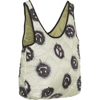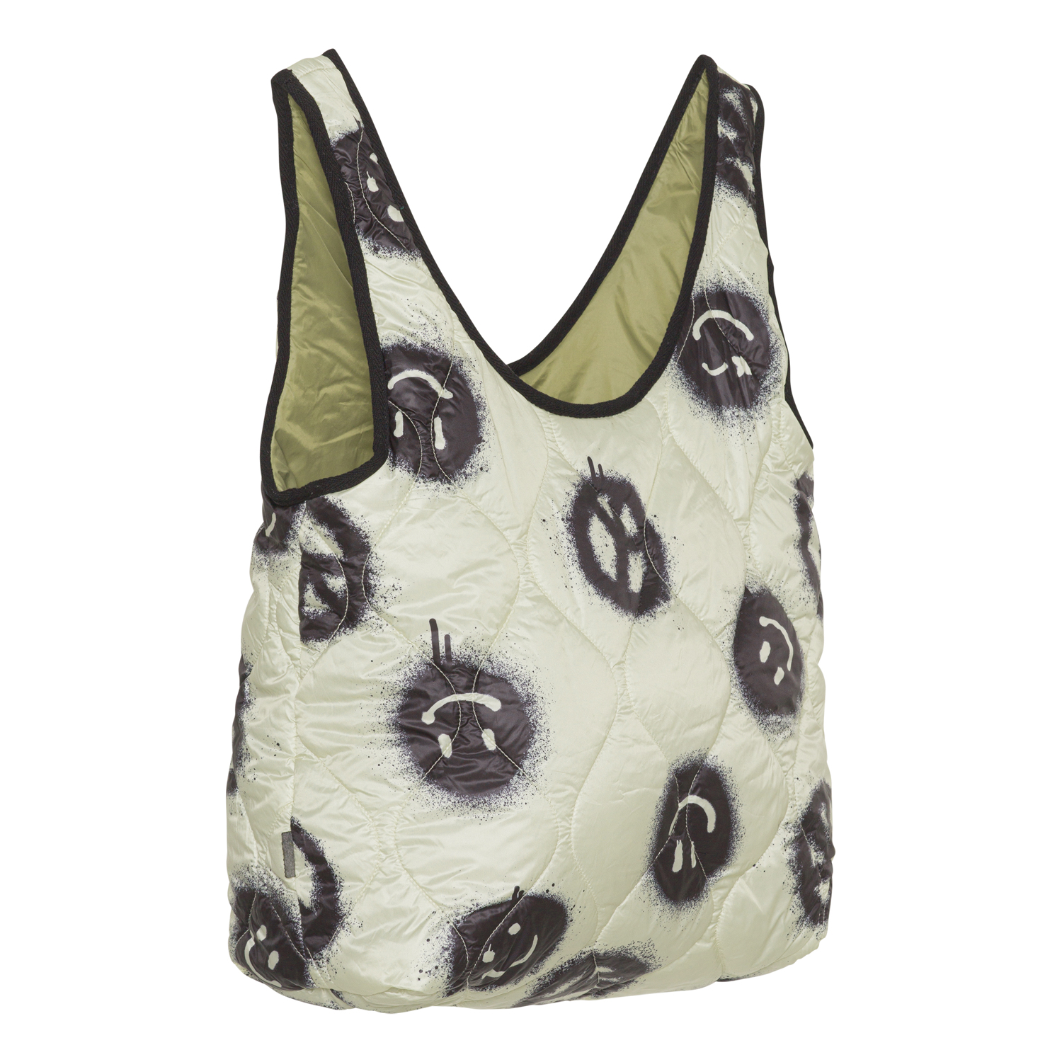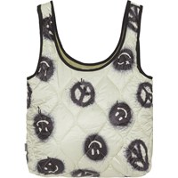 En quiltad väska i off-white med sprejade smileys och peacetecken i svart. Väskan har svarta binding runt i de öppna kanterna, och armygrönt foder.