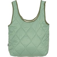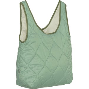 En quiltad väska i grön med mörkgrön binding i de öppna kanterna, och beige foder.