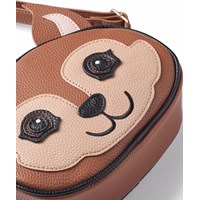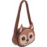 Brun ekorre väska. Väskan mäter 19 cm i bredd, 14 cm i höjd och 5,5 cm i djup. Väskan har en justerbar rem och en liten innerficka med dragkedja.