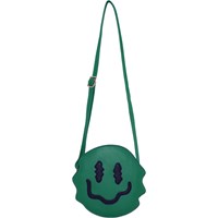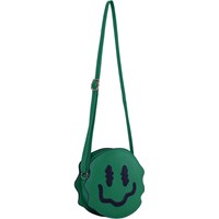 Grön axelväska med en söt design av ett leende glitch-ansikte på framsidan. Väskan har en justerbar axelrem.