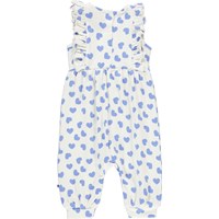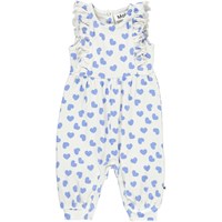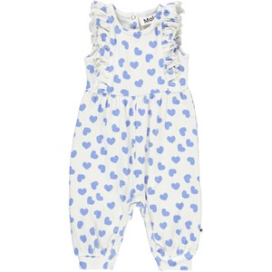Fallon är en babydräkt utan ärmar och med volangkanter på axlarna. Här är dräkten i vit med små blå hjärtan. Tryckknappar i nacken och mellan benen gör dräkten enkel att få av och på.