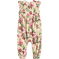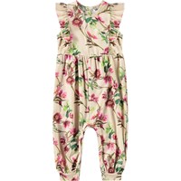 Beige ärmlös jumpsuit tillverkad av mjuk ekologisk bomull med en söt volangkant fram och bak, tryckknappar vid halsen och mellan benen för enkel påklädning. Mönster med julrosor i vitt och ljusrosa nyanser med gröna blad.