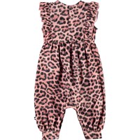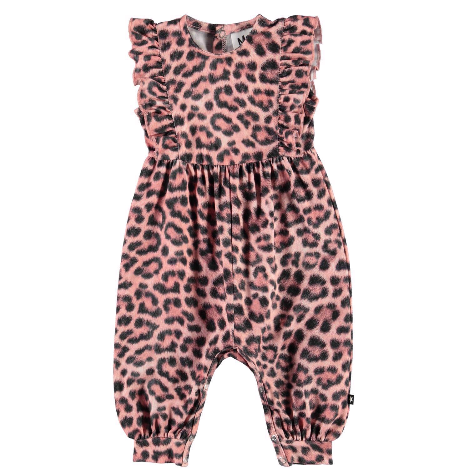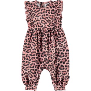 Fallon är en babydräkt utan ärmar med volangkant på axlarna. Dräkten är i ett rosa leopardmönster. Tryckknappar i nacken och mellan benen gör den enkel att få av och på.