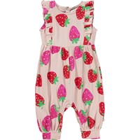 Fallon är rosa babydräkt i jordgubbsmönster i 100% bomullsjersey. Fallon är utan ärmar och har volanger upptill både fram ochbak.Fallon har långa ben med tryckknappar mellan, vilket gör den enkel att ta av och på.