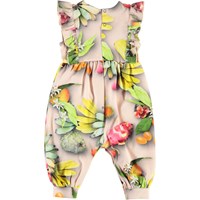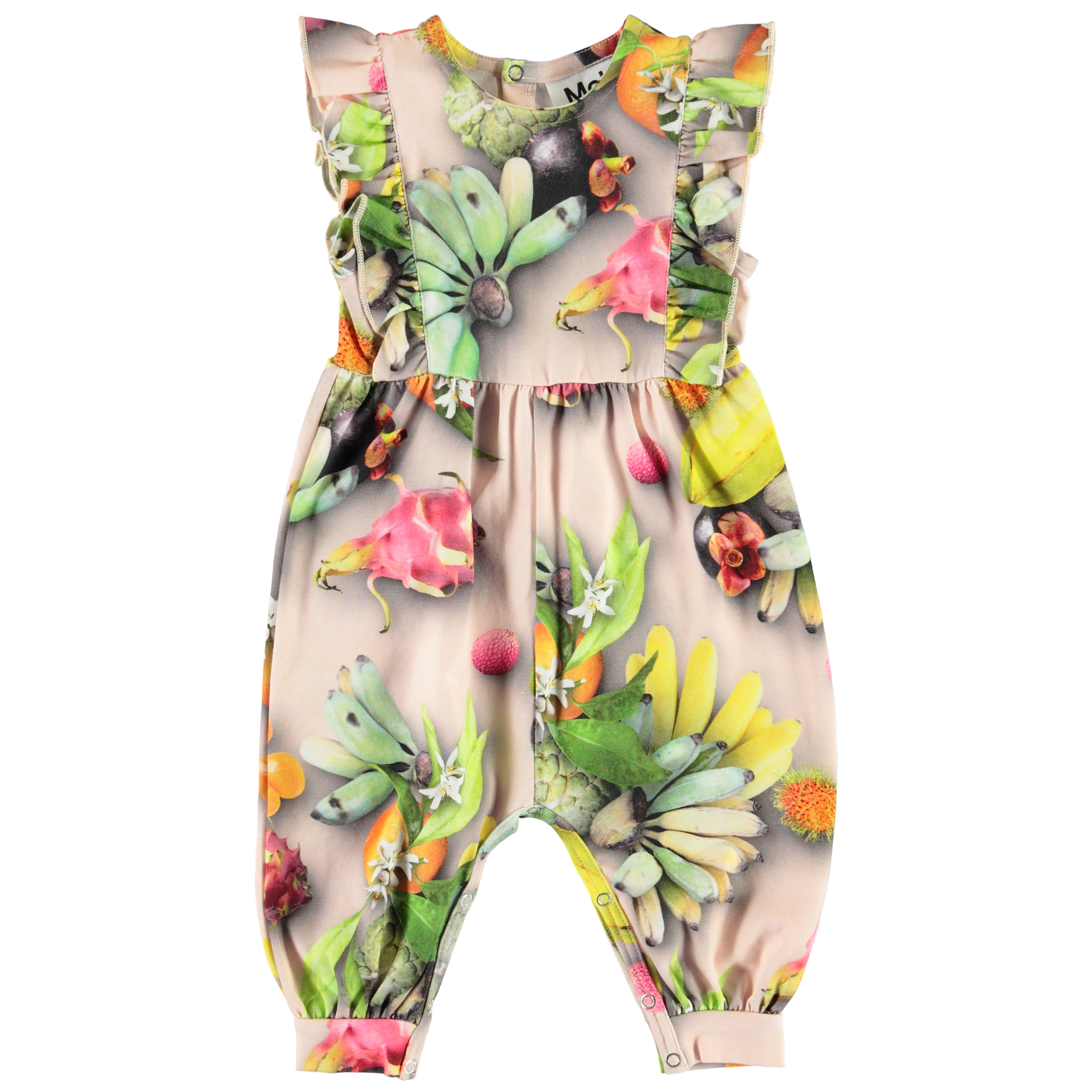 Fallon är en baby dräkt med långa ben i all-over tryck av frukter. Dräkten har volangkanter vid ärmslut, samt tryckknappar i nacken och mellan benen, som gör dräkten lätt att ta av och på.