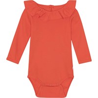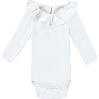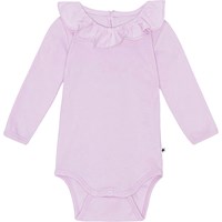 ljuslila babybody med långa ärmar i ribbad ekologisk bomull. Bodyn har en söt poplinkrage som går ut över axlarna, knappar i ryggen och tryckknappar mellan benen som gör den enkel att ta av och på.