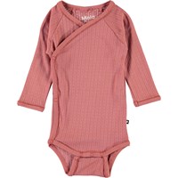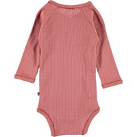 Faye är en rosa babybody med ett fint hålmönster och långa ärmar. Bodyn har en sned stängning med tryckknappar framtill, samt tryckknappar mellan benen.