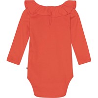 Röd babybody med långa ärmar i ribbad ekologisk bomull. Bodyn har en söt poplinkrage som går ut över axlarna, knappar i ryggen och tryckknappar mellan benen som gör den enkel att ta av och på.
