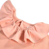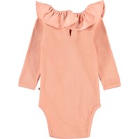 Roséfärgad långärmad body för de små i ribbad ekologisk bomull. Bodyn har en poplinkrage, en knäppning i ryggen och tryckknappar mellan benen för enkel påklädning.