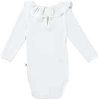 Vit babybody med långa ärmar i ribbad ekologisk bomull. Bodyn har en söt poplinkrage som går ut över axlarna, knappar i ryggen och tryckknappar mellan benen som gör den enkel att ta av och på.