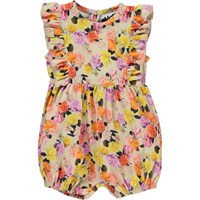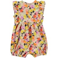 Felicia är en gul babydräkt i 100% ekologisk bomullsjersey. Heldräkten är utan ärmar och med volangr upptill, både fram och bak. Felicia har korta ben med tryckknappar mellan, vilket gör den enkel att ta av och på. Dräkten är här med rosor i alla världens färger.