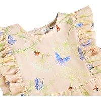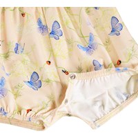 Rosa sparkdräkt för de små i ekologisk bomull med fjärilsmönster. Den är ärmlös med fina volangdetaljer, korta ben med resår och en rymlig passform för optimal rörelsefrihet. Den är även lätt att knäppa med tryckknappar bak och mellan benen vilket gör den perfekt för varma dagar.