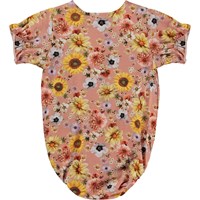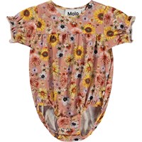 Rosa babybody med blommor. Bodyn har rymlig passform och korta ärmar med rynkeffekt. Tryckknappar på ena axeln och mellen benen gör den enkel att ta av och på.