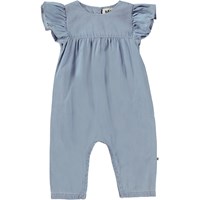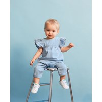 Fifi är en ljusblå babydräkt med långa ben och små volangärmar i 100% bomull. Fifi har tryckknappar mitt bak och mellan benen, vilket gör den enkel att ta av och på.