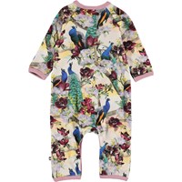Fiona är en baby heldräkt i trycket 'Oriental Peacocks' med ljusrosa kantband. Tryckknappar vid hals och i grenen gör det lätt att få dräkten av och på.
