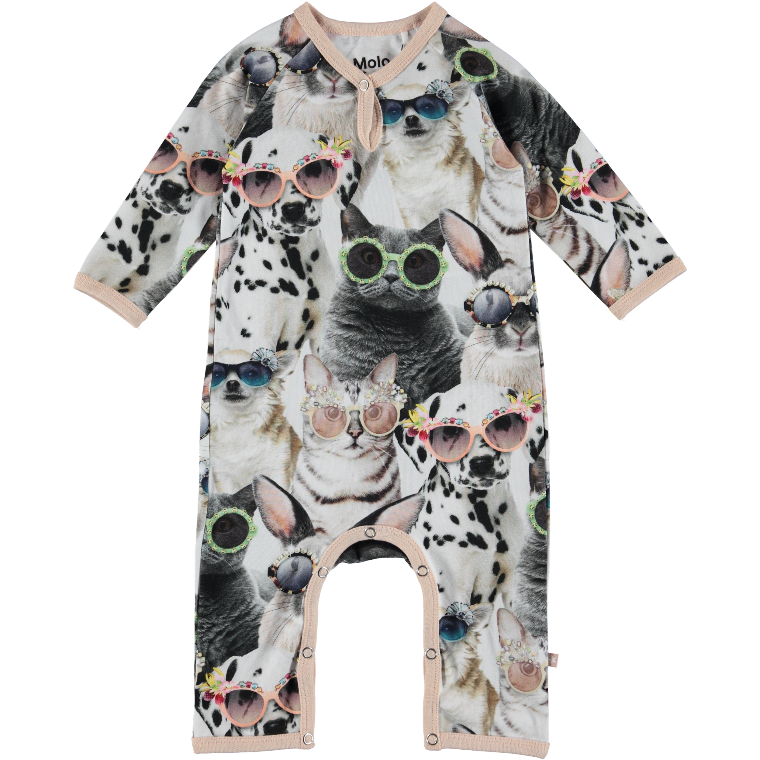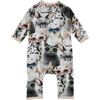 Långärmad baby heldräkt i all over tryck av roliga djur. Tryckknappar vid hals och i grenen gör dräkten lätt att ta av och på.
