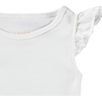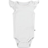 Vit body i ekologiskt ribbat bomullstyg för de små. Bodyn har små volangärmar i poplin och tryckknappar mellan benen, vilket gör den enkel att ta på och av.