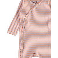 Flora är en lila, rosa och rödrandig babydräkt med ett fint hålmönster. Dräkten har långa ärmar och ben. Dräkten har även en sned knappstängning framtill, samt tryckknappar mellan benen som gör att dräkten är lätt att ta på och av.