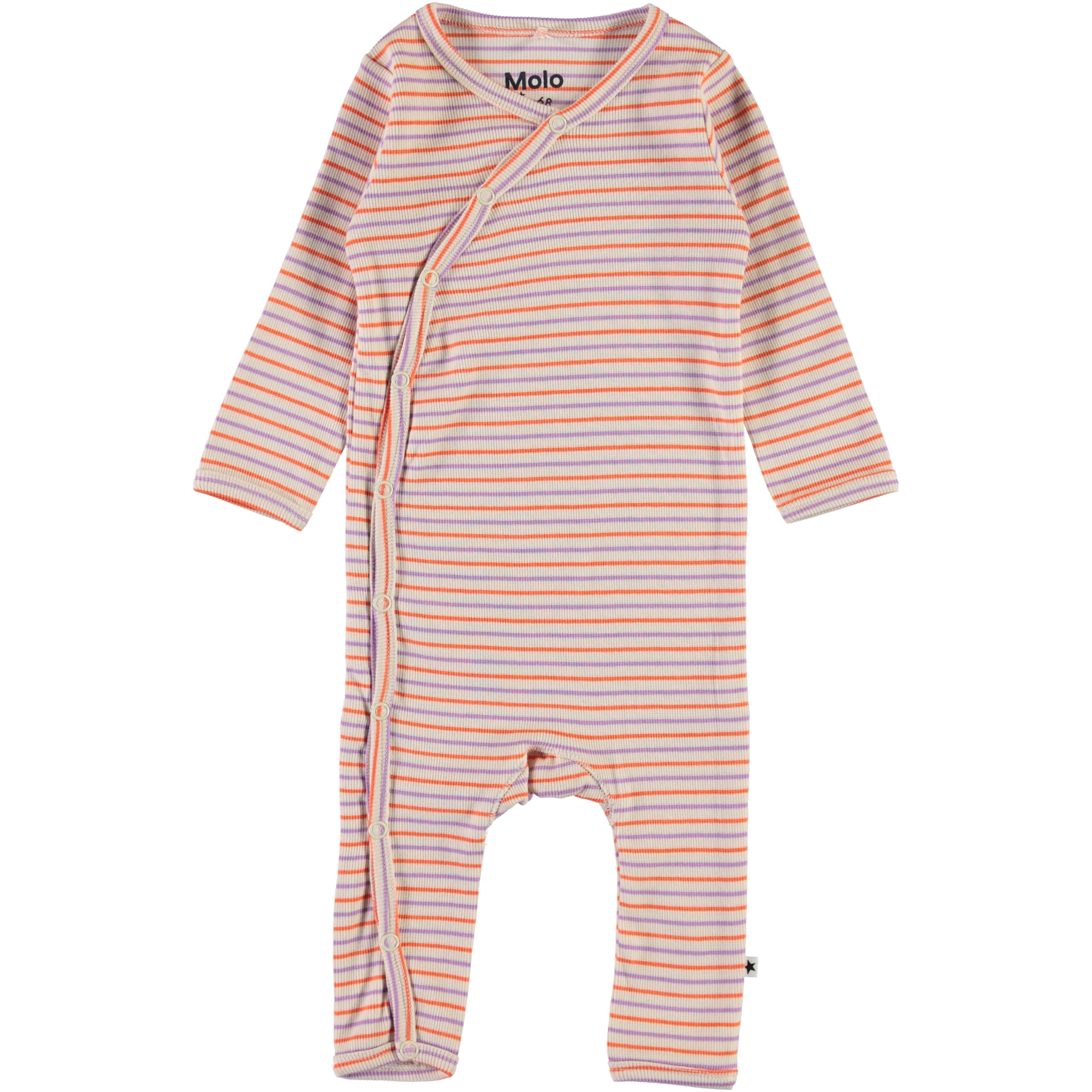 Flora är en lila, rosa och rödrandig babydräkt med ett fint hålmönster. Dräkten har långa ärmar och ben. Dräkten har även en sned knappstängning framtill, samt tryckknappar mellan benen som gör att dräkten är lätt att ta på och av.
