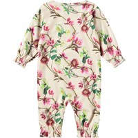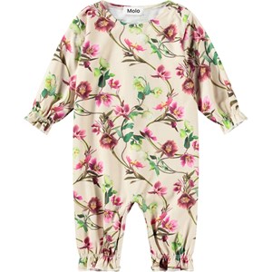 Beige overall för de små tillverkad av mjuk ekologisk bomull. Overallen är lös i passformen med långa ärmar och ben och har resår vid handlederna och fotlederna, vilket ger en liten volangkant. Det finns också tryckknappar på ena axeln och mellan benen, vilket gör det enkelt att ta på och av. Den har ett mönster med julrosor i vitt och ljusrosa nyanser, vackert sammanflätade med sina gröna blad.