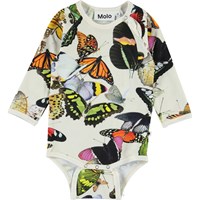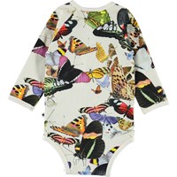 Fonda är en långärmad baby body med all-over tryck av en snygg färgrik fjärilsflock. Fonda har ljusa kantband och tryckknapp i kragen och mellan benen, som gör bodyn lätt att ta av och på.