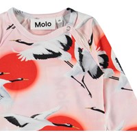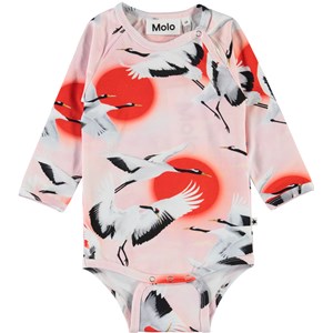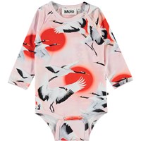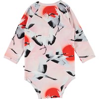 Fonda är en rosa långärmad babybody med flygande tranor. Fonda har en tryckknapp i kragen och mellan benen, vilket gör bodyn lätt att få på och av.