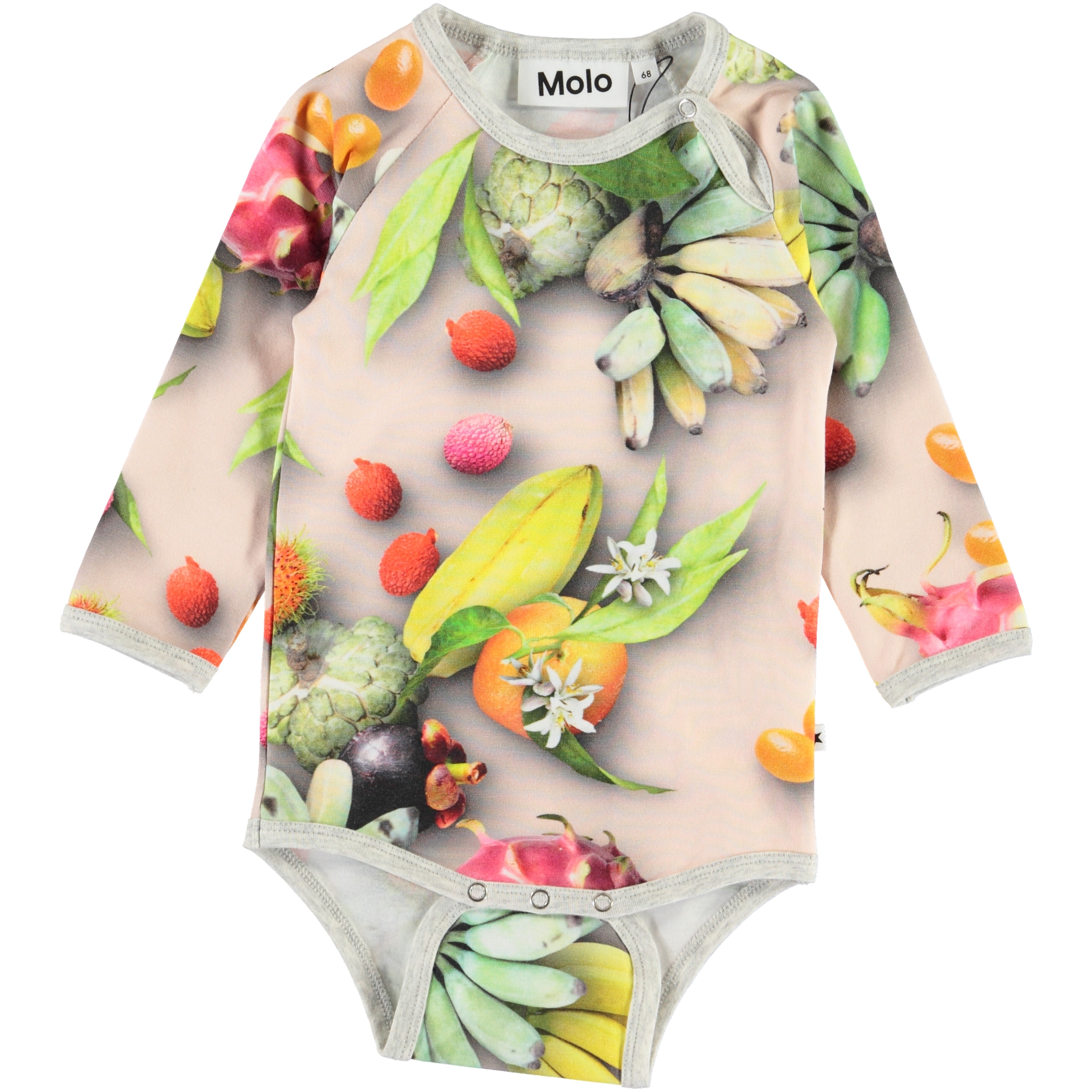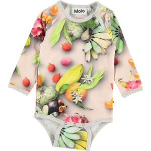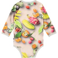 Fonda är en långärmad baby body med all-over tryck av tropiska frukter. Fonda har grå kantband och tryckknapp i kragen och mellan benen, som gör bodyn lätt att ta av och på.