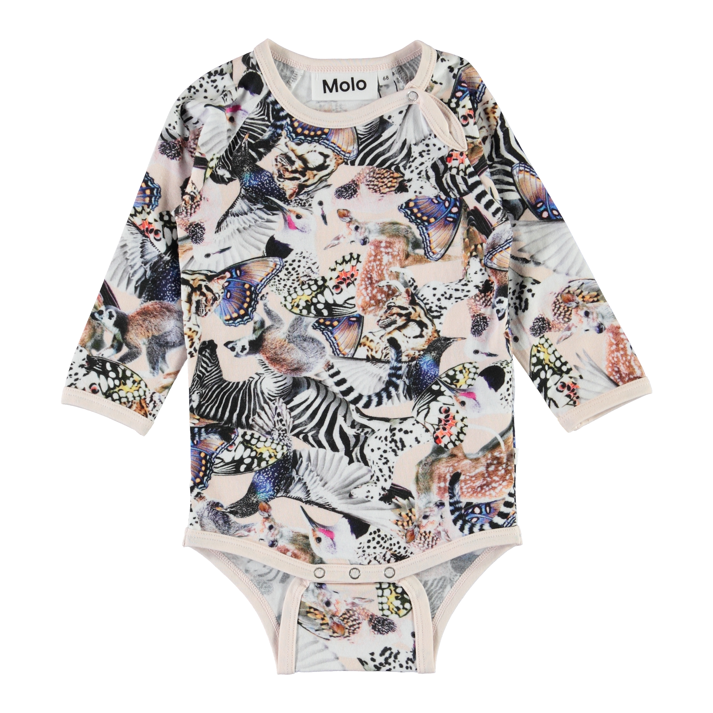 Fonda är en långärmad babybody med djur som utgör ett fint mönster. Fonda har en tryckknapp i kragen och mellan benen, vilket gör bodyn lätt att få på och av.