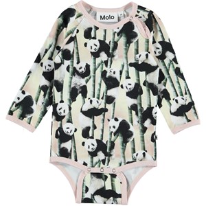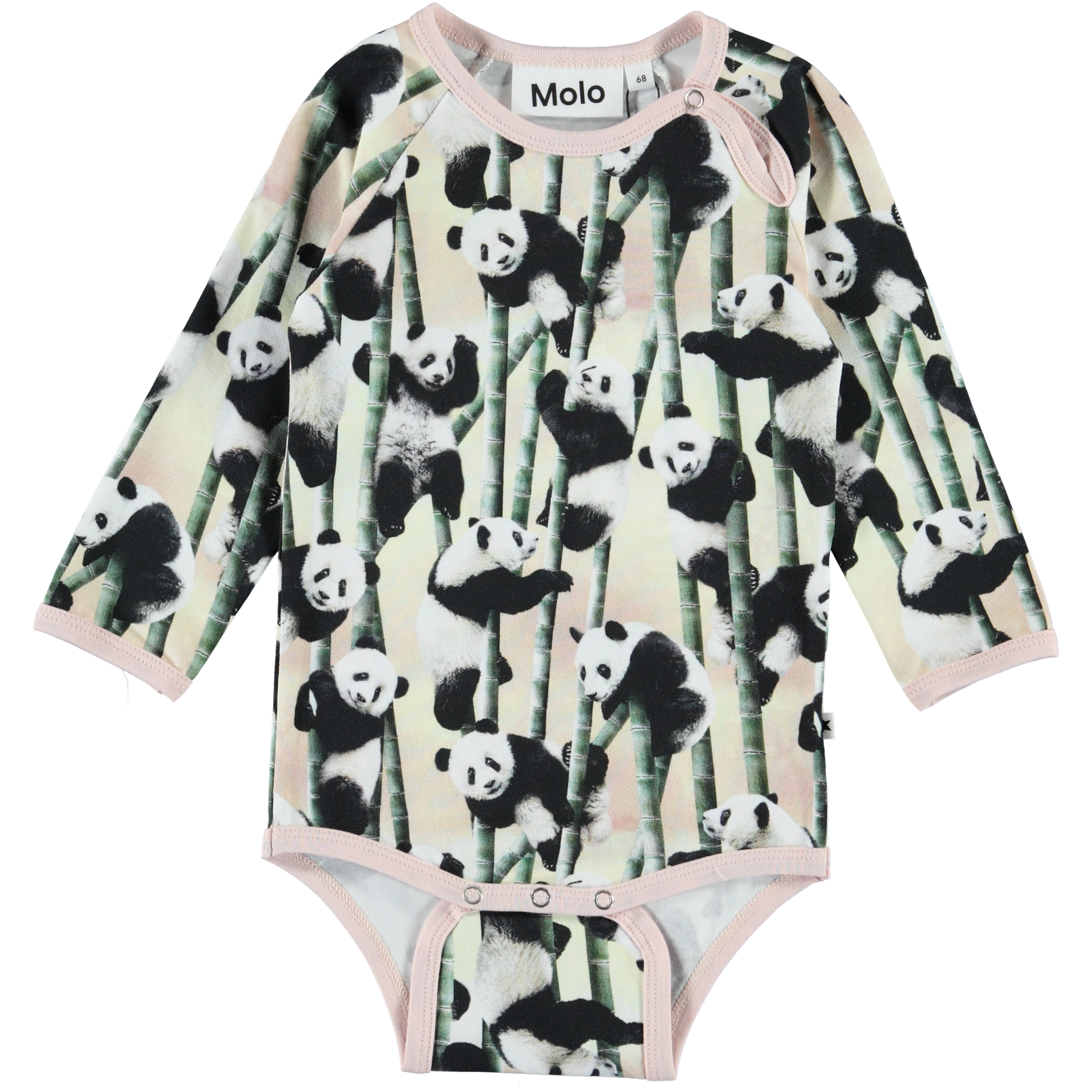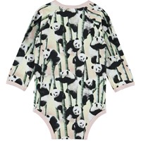 Fonda är en långärmad baby body med tryck av pandabjörnar och deras favoritmat bambus. Fonda har ljusrosa kantband och tryckknapp i kragen och mellan benen, som gör bodyn lätt att ta av och på.