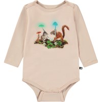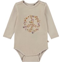 Beige babybody med ett peacetecken av blommor framtill. Denna body är tillverkad i 100% bomull, har långa ärmar och tryckknappar i kragen och mellan benen, vilket gör den enkel att ta av och på. Matcha ev. denna body med byxorna, Seb, i samma mönster.
