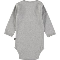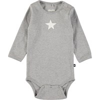Långärmad, grå baby body med tryckt stjärna fram. Tryckknappar i hals och gren gör det lätt att få bodyen av och på.