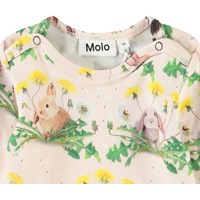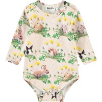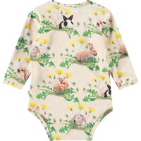 Långärmad body i ekologisk bomull för de små. Bodyn har fina kanter och knappar på axlarna och mellan benen för enkel påklädning. Denna body har ett mönster av kaniner och maskrosor.