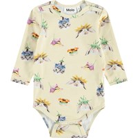 Långärmad, gul body för de små i ekologisk bomull med djurmotiv. Den har fina kanter och tryckknappar på axlarna och mellan benen för enkel på- och avklädning.