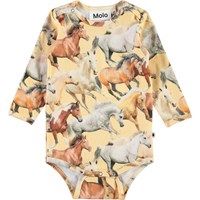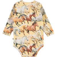 Foss är en ljusgul långärmad babybody med hästar. Tryckknappar vid hals och mellan benen gör den enkel att ta av och på.