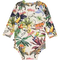 Foss är en ljus långärma babybody med en färgrik fantasidjungel. Tryckknappar vid hals och mellan benen gör den enkel att ta av och på.