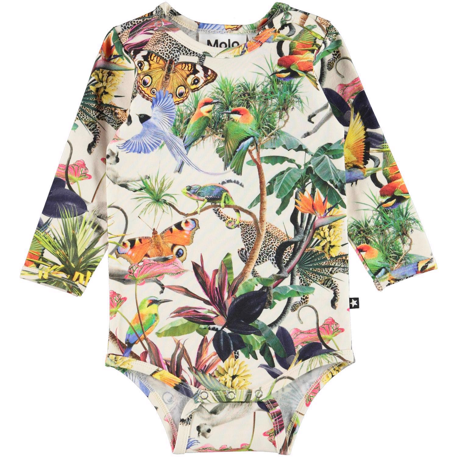 Foss är en ljus långärma babybody med en färgrik fantasidjungel. Tryckknappar vid hals och mellan benen gör den enkel att ta av och på.