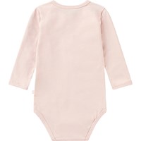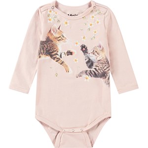 Puderfärgad långärmad body tillverkad av ekologisk bomull. Bodyn har tryckknappar vid kragen och mellan benen, vilket gör den enkel att ta av och på, och har ett tryck av två lekfulla kattungar under en himmel av små vita blommor.