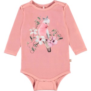 Foss är en korallfärgad långärmad babybody med en papegoja och massa blommor. Tryckknappar vid hals och mellan benen gör denenkel att ta av och på.