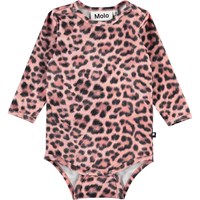 Foss är en rosa långärmad babybody med leopardmönster. Tryckknappar vid hals och mellan benen gör den enkel att ta av och på.