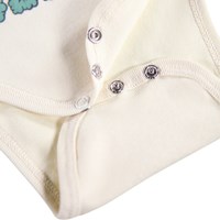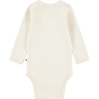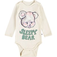 Off-white långärmad body för de små i ekologisk bomull med en söt björn och texten 'Sleepy bear'. Bodyn har kantband och knäppning på axlarna och mellan benen för enkel på- och avklädning.