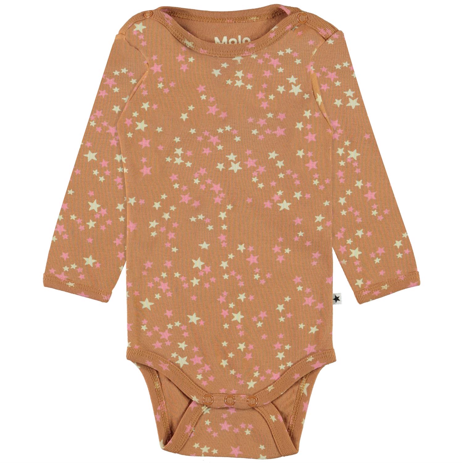 Foss är en långärmad brun body med sjärnor. Bodyn har tryckknappar i nacken.