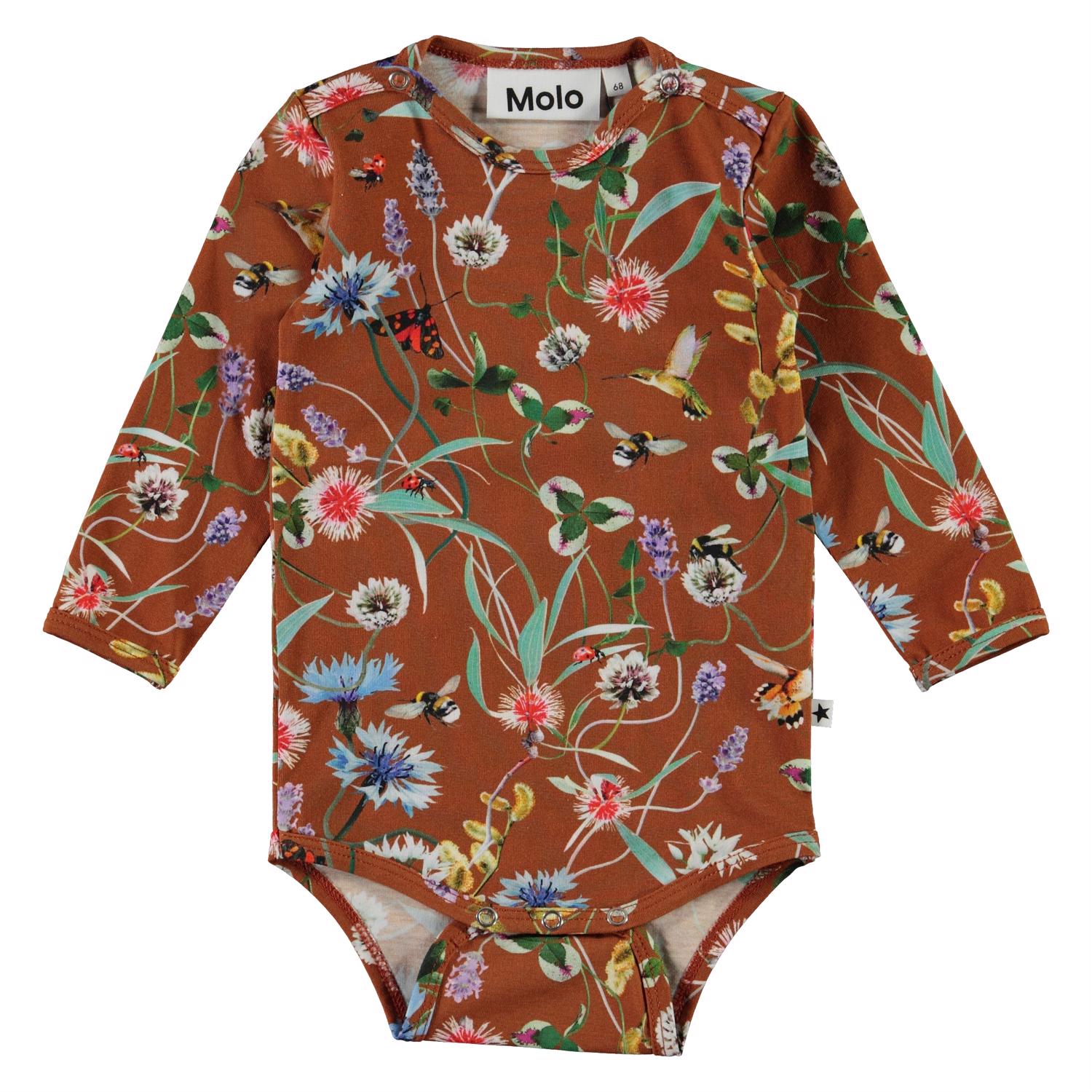 Foss är en långärmad brun body i med ett tryck av vilda blommor och små insekter. Bodyn har tryckknappar i nacken.