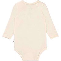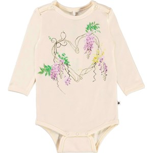 Foss är en ljus långärmad babybody med blåregn som bilder ett hjärta. Tryckknappar vid hals och mellan benen gör den enkel att ta av och på.