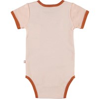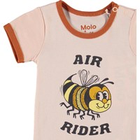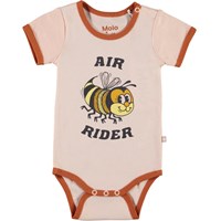 Fossie är en kortärmad, rosa body med ett tryck på bin och texten "Air rider". Fossie har brun kant. Tryckknappar i nacken och mellan benen gör den enkel att ta på och av.