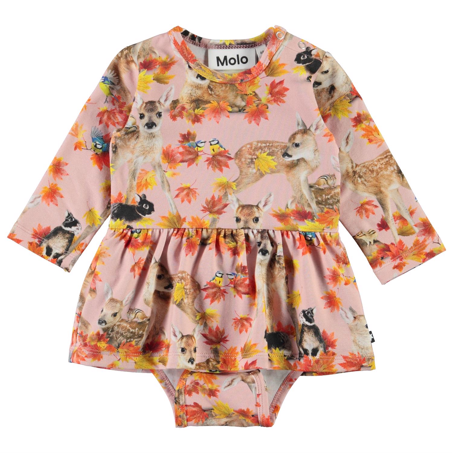 Frances är en långärmad rosa body med ett tryck av rådjur och kaniner, samt guldiga löv. Frances har en peplumkjol och tryckknappar på ena axeln och mellan benen.