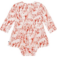 Råvit babybody i stretchig ekologisk bomullsjersey. Bodyn har rund hals, peplumkjol, vita kantband, tryckknappar vid halsen och mellan benen, vilket gör den enkel att ta av och på. Bodyn har ett rött mönster av handritade hästar.