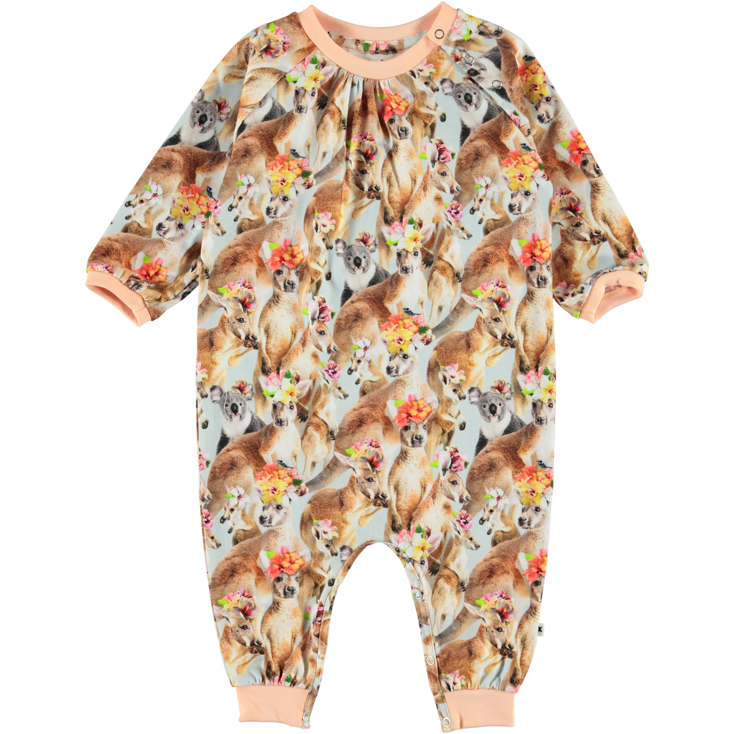 Francine är en baby heldräkt med all-over tryck med tryck av kängurur och koala björnar med blommor på huvudet. Francine har lätt drapering vid halsen, samt en bra rymlighet. Tryckknappar vid hals och mellan benen gör dräkten lätt att ta av och på.